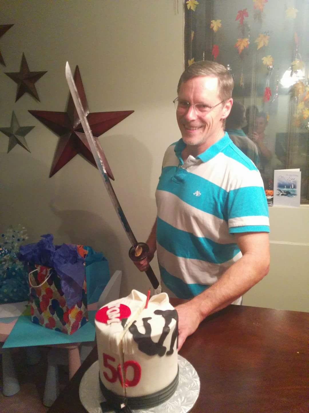 Tom George recently celebrated his 50th Birthday and he still has the touch with his Katana. Yes, that is a real Japanese sword he is holding. You can see the perfect cut he made to his cake right through the Black Belt. Congratulations, Tom.